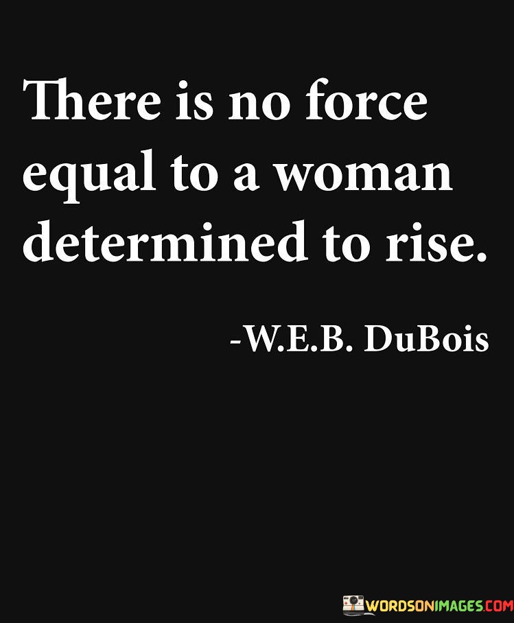 This powerful quote encapsulates the unstoppable nature of a determined woman on the path of success and empowerment. The phrase "There is no force equal to a woman determined to rise" speaks to the immense strength and resilience that a woman possesses when she is committed to achieving her goals and breaking barriers. It emphasizes the transformative power of determination and ambition in a woman's life, highlighting her unwavering will to overcome obstacles and reach new heights. This quote celebrates the indomitable spirit of women who refuse to be held back by societal constraints or limitations, standing firm in their resolve to ascend and flourish. In a broader context, this quote serves as a source of inspiration for all individuals, reminding us of the limitless potential within each person, regardless of gender. It challenges societal norms and stereotypes that may have historically hindered women's progress, showing that when a woman sets her mind on a mission, her determination becomes a force to be reckoned with. This quote also fosters an environment of empowerment and support for women, encouraging society to recognize and value their aspirations and accomplishments. It reinforces the idea that women's empowerment and success contribute to the progress and prosperity of society as a whole. Ultimately, this quote celebrates the power of determination and the tenacity of women in achieving their dreams, motivating us to support and uplift one another as we collectively strive for progress and equality.