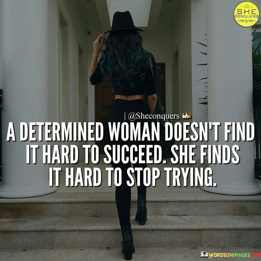 This powerful quote highlights the unwavering perseverance and tenacity of determined women in their pursuit of success. It suggests that for a woman with a strong resolve, the journey to success may present challenges and obstacles, but what truly defines her is the inability to give up or abandon her dreams. The phrase "A determined woman doesn't find it hard to succeed; she finds it hard to stop trying" emphasizes that success is not a distant and elusive goal for such women; rather, it is the relentless effort and determination that propel them forward, no matter how tough the road may be. They are driven by an unyielding spirit that compels them to keep pushing beyond barriers, learning from failures, and persistently striving towards their objectives.This quote serves as an inspiration and a testament to the strength and resilience of women who refuse to be deterred by setbacks or difficulties. It celebrates their ability to adapt, evolve, and grow through adversity, showing that their success lies not just in reaching a destination but in the journey itself. By framing success as an ongoing process of perseverance, the quote challenges the notion that success is easily attainable or granted without effort. It acknowledges that determination is the driving force behind achieving meaningful and sustainable accomplishments. Moreover, the quote sends a message of encouragement to women, reminding them of their capacity to achieve greatness through unwavering determination and resilience. Ultimately, it celebrates the unbreakable spirit of determined women, recognizing that their relentless pursuit of success is what sets them apart and empowers them to achieve remarkable things in life.