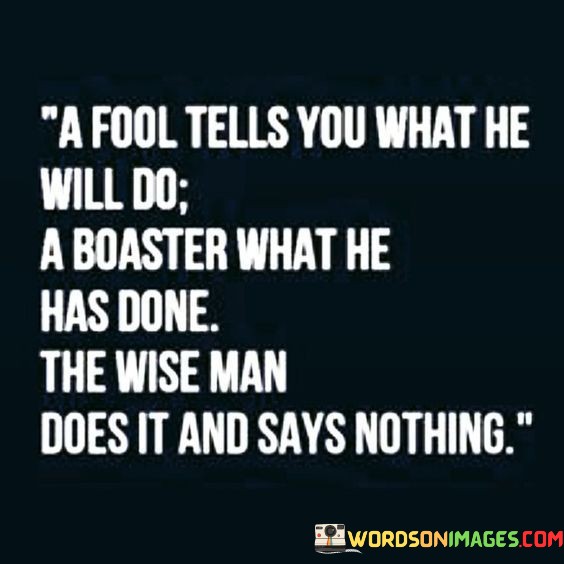 This quote highlights different behaviors and attitudes exhibited by individuals. It contrasts the actions of a fool, a boaster, and a wise person. The fool is someone who makes grand promises and talks about what they intend to do in the future. However, they may lack the follow-through to actually accomplish those plans.