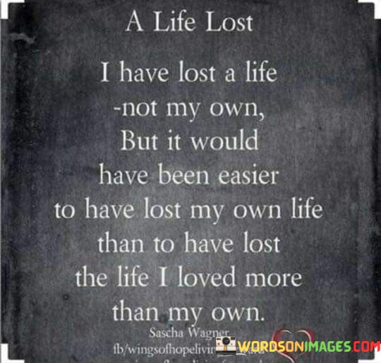 The quote conveys the profound loss of someone dear. "A life lost" signifies a significant absence. "Lost a life not my own" reflects the grief of losing another's life. The quote highlights the anguish of losing someone cherished more than one's own life.