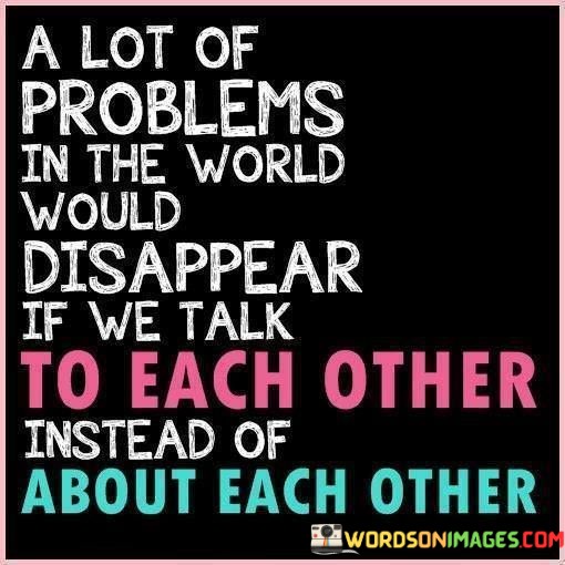 The quote highlights the importance of communication and dialogue. "Talk to each other" signifies open and direct communication. "About each other" implies gossip or negative assumptions. The quote conveys the idea that many global issues could be resolved or mitigated if people engaged in constructive conversations rather than perpetuating misunderstandings.