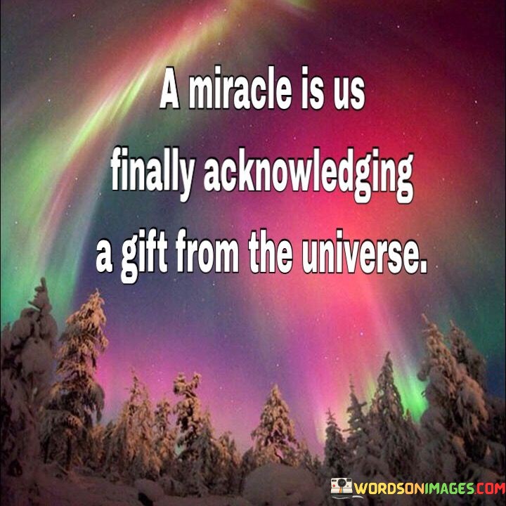 The quote celebrates the idea of recognizing the extraordinary in the ordinary. "Miracle" signifies a rare and wondrous event. "Acknowledging a gift" implies appreciating something received. The quote conveys that miracles often lie in our capacity to appreciate the blessings bestowed upon us by the universe.