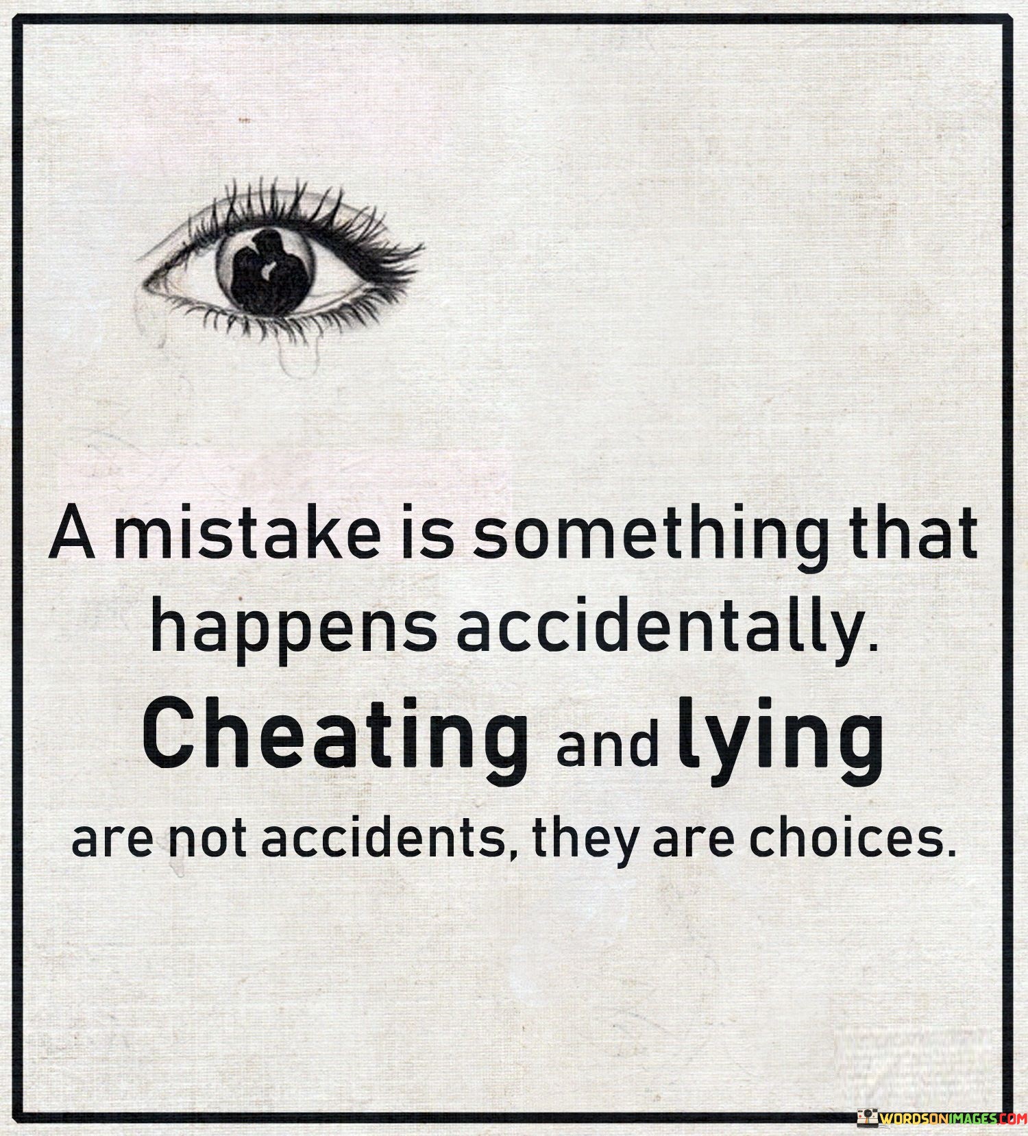 The quote "a mistake is something that happens accidentally; cheating and lying are not accidents, they are choices" distinguishes between accidental errors and deliberate actions of dishonesty. It suggests that the latter—cheating and lying—are conscious decisions, while mistakes are unintentional outcomes.