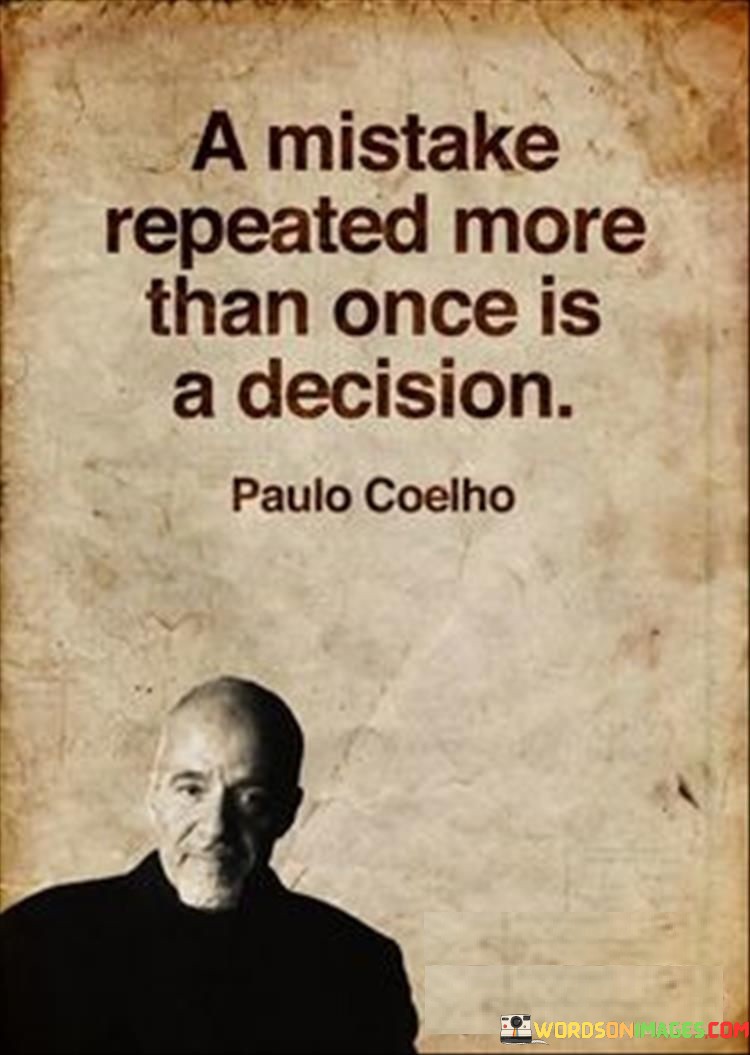 In essence, the quote serves as a reminder to break free from destructive patterns and take responsibility for one's actions. It empowers individuals to learn from their mistakes, make intentional decisions, and choose a path of growth and self-improvement. By recognizing the difference between a mistake and a decision, we can move towards more purposeful and positive actions in our lives.