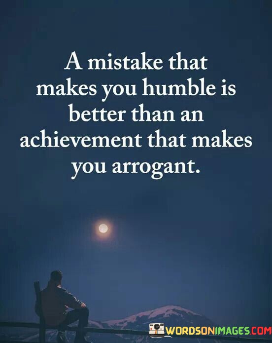 This quote highlights the value of humility and personal growth over pride and arrogance. It suggests that making a mistake that leads to humility is more beneficial than achieving something that fosters arrogance. It underscores the importance of learning from one's mistakes and using them as opportunities for self-improvement.