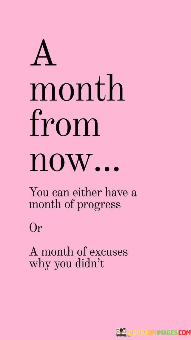 This quote emphasizes the importance of taking action and making progress towards our goals. It presents a clear choice between two possibilities: either having a month filled with accomplishments and progress or a month spent making excuses for not taking action.