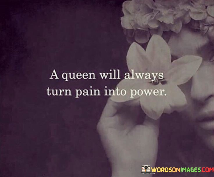 "A queen will always turn pain into power" suggests that, like royalty, such a woman is adept at channeling her experiences of pain, hardship, and challenges into sources of personal growth, inner strength, and empowerment.