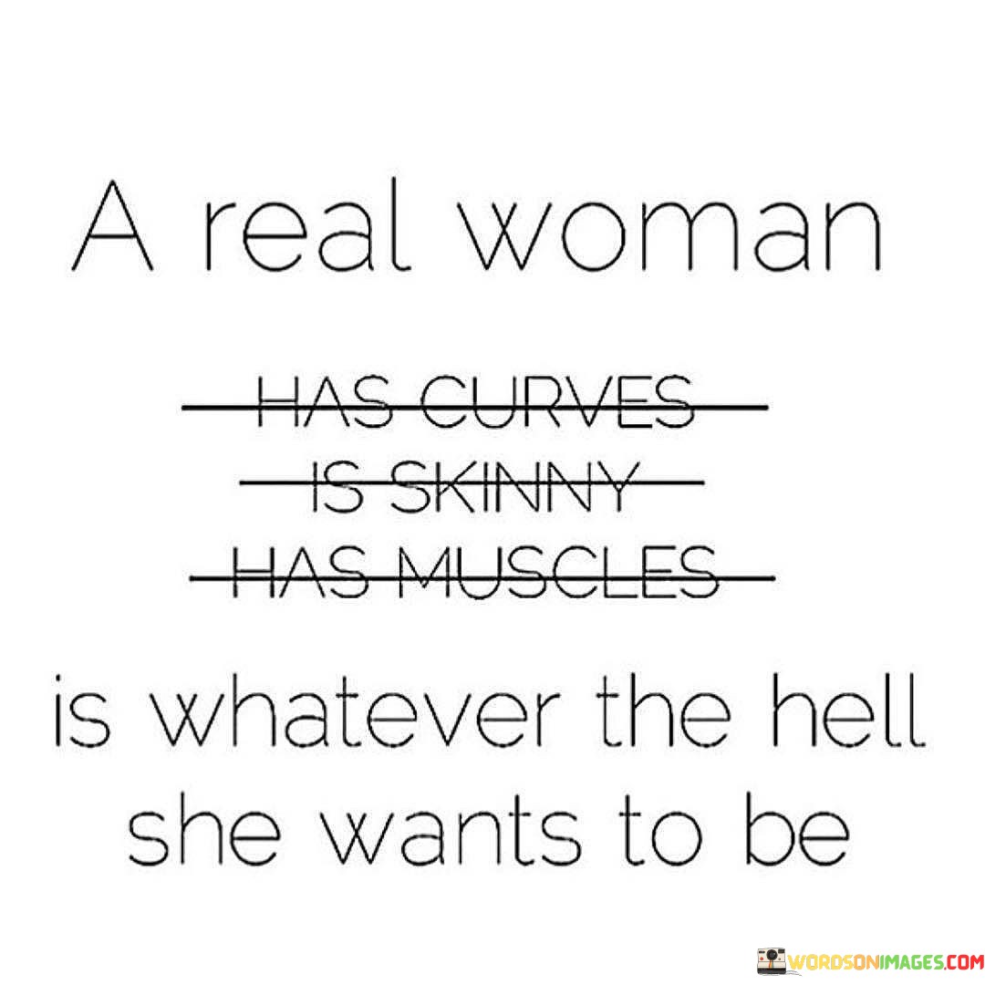 This quote celebrates the diversity and individuality of women, breaking away from societal stereotypes and body standards. It emphasizes that there is no one-size-fits-all definition of a "real woman." Instead, a real woman can have different body types, sizes, and shapes, and she should have the freedom to embrace and express herself in whichever way feels authentic to her.The phrase challenges the notion that a woman's worth is determined by her physical appearance. It rejects the pressure to conform to narrow beauty ideals and promotes body positivity and self-acceptance. Whether a woman is curvy, skinny, muscular, or anything else, she is real and valid as she is.By encouraging women to be whatever they want to be, the quote empowers them to reclaim agency over their bodies and lives. It recognizes that each woman's identity is unique, and she should define herself on her own terms, free from the judgment and expectations of others. It promotes a message of inclusivity, acceptance, and self-love, encouraging women to embrace their bodies and celebrate their individuality.Ultimately, this quote serves as a powerful reminder that a woman's value goes far beyond her physical appearance. It calls for a shift in the way society views and appreciates women, recognizing that their worth lies in their intelligence, accomplishments, passions, and the content of their character, rather than superficial standards of beauty. By promoting body positivity and self-empowerment, the quote celebrates the diverse beauty of all women and encourages them to be confident in who they are, unapologetically embracing their own unique selves