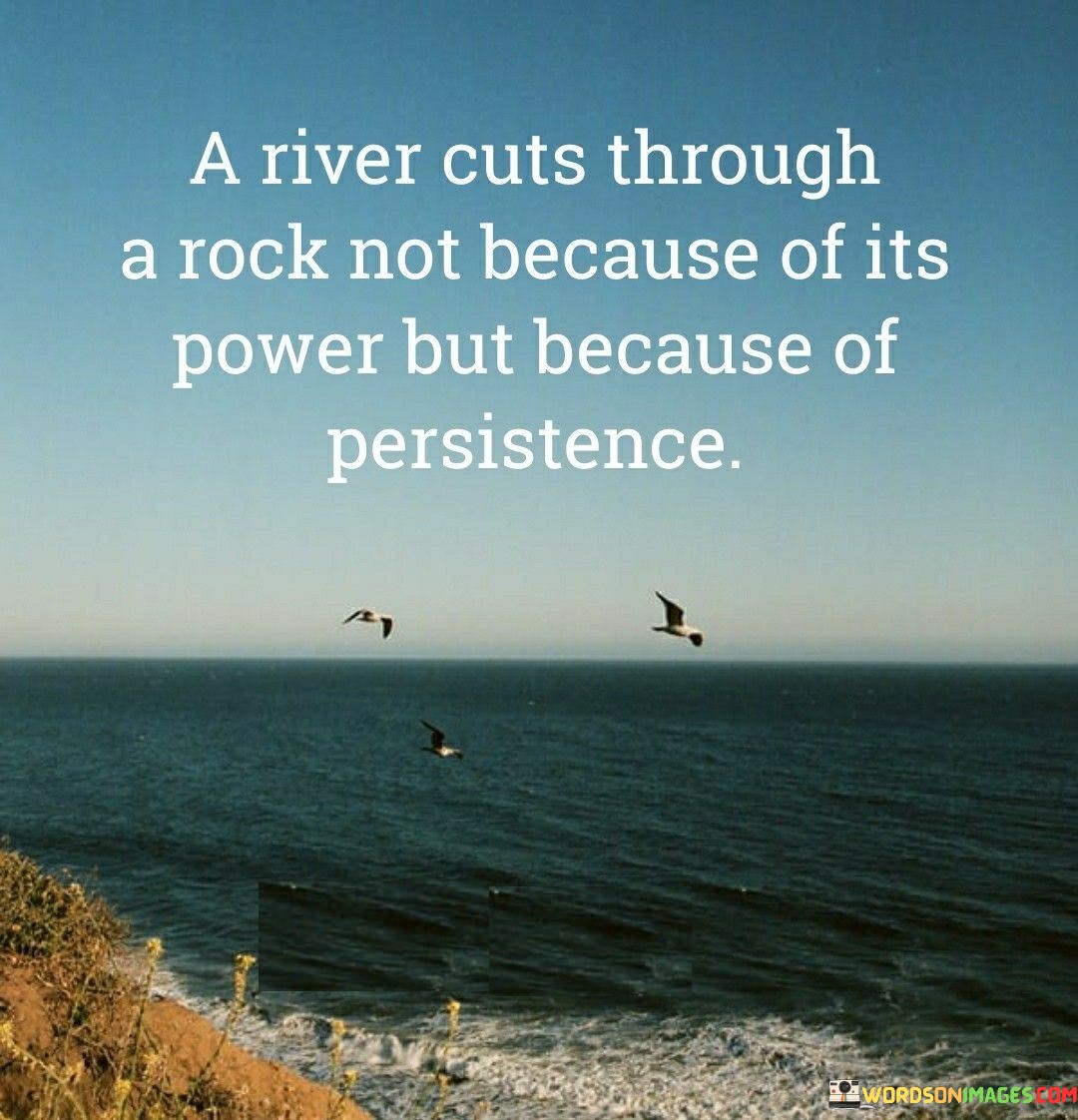 This quote illustrates the strength of persistence. In the first part, "a river cuts through a rock," it showcases the impact of gradual effort. The second part, "not because of its power," suggests that consistency, not force, is the driving factor.