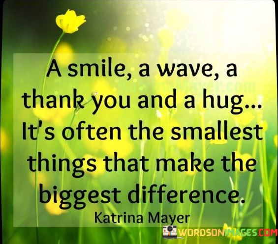 This quote underscores the significance of small, genuine acts of kindness and gratitude in making a meaningful impact on people's lives. It emphasizes that simple gestures like offering a smile, giving a friendly wave, expressing gratitude with a thank you, or offering a warm hug can have a profound and positive influence on others.