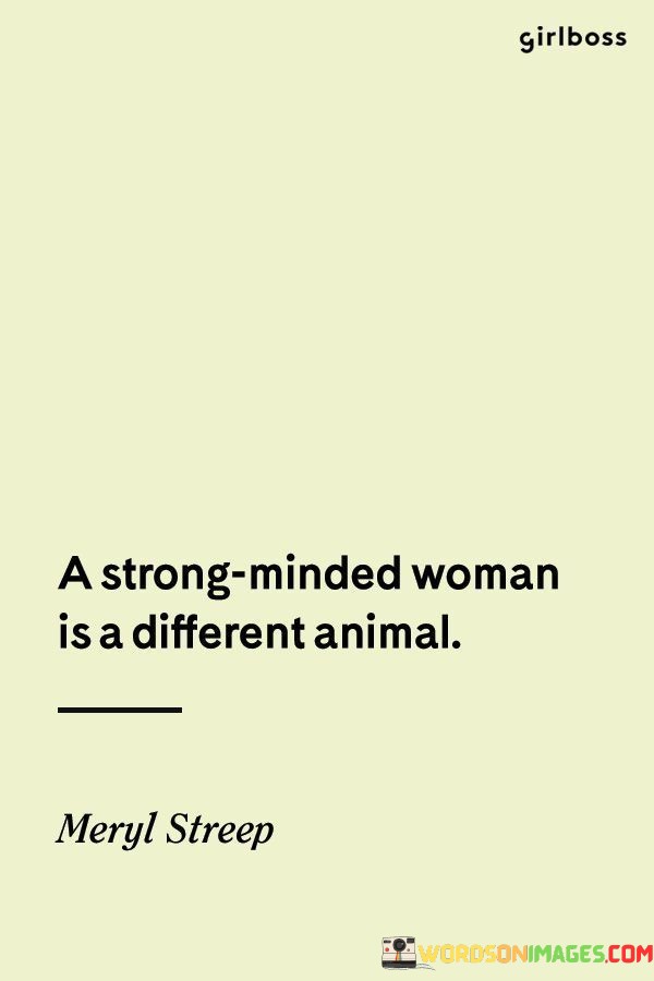 This intriguing quote portrays strong-minded women as unique and distinct individuals, setting them apart from the norm. It suggests that their mental strength, determination, and resilience make them stand out like a different species or "animal." The phrase "A strong-minded woman is a different animal" celebrates the qualities of independence, confidence, and unwavering resolve that define these women. It acknowledges that they are not easily influenced or swayed by external pressures, and they have the courage to march to the beat of their own drum, unapologetically embracing their individuality. The quote celebrates the power of strong-minded women to break free from societal expectations, forge their paths, and make a lasting impact on the world around them.