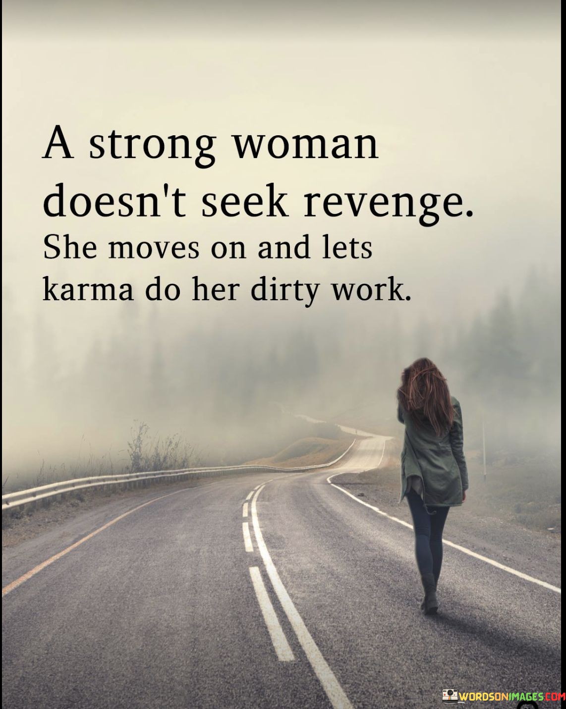 "A strong woman doesn't seek revenge; she moves on and lets karma do her dirty work" suggests that a strong woman chooses not to engage in vindictive behavior or seek revenge against those who have wronged her.