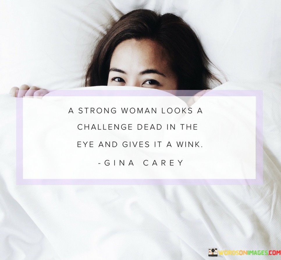 This quote serves as a powerful portrayal of a strong woman's mindset and approach to challenges. It celebrates her confidence and determination in the face of adversity, demonstrating her ability to tackle obstacles with courage and resilience. By "looking a challenge dead in the eye," the quote emphasizes her fearlessness and willingness to confront difficulties directly, undeterred by their magnitude. The act of giving the challenge a wink adds an element of sass and self-assuredness, suggesting that she meets obstacles with a playful and confident attitude. This portrayal of strength and determination encourages others to adopt a similar mindset, demonstrating the importance of facing challenges with bravery and self-belief. The quote highlights the transformative power of a strong woman's perspective, inspiring others to embrace challenges as opportunities for growth and proving that with the right mindset, they can be conquered and overcome. Ultimately, it celebrates the strength and resilience of women, encouraging them to embrace their power and face life's challenges with a wink and a sense of unwavering confidence.