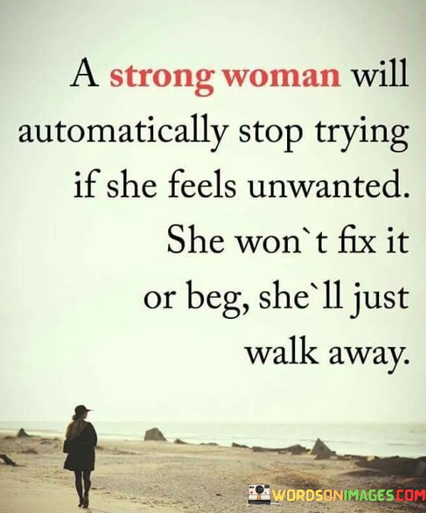 This quote emphasizes the self-respect and strength of a confident woman. It suggests that a strong woman knows her worth, and if she feels unappreciated or unwanted in any situation, she won't waste her time trying to change that perception. Instead of fixing the situation or begging for validation, she chooses to prioritize her well-being and simply walks away.