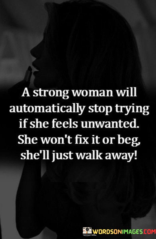 This quote portrays the strength and self-respect of a woman who values herself. It suggests that when a strong woman feels unwanted or unappreciated in a relationship, she will not waste time trying to fix things or begging for attention. Instead, she will assert her worth and choose to walk away from the situation.