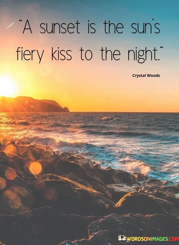 The quote emphasizes the visual spectacle of sunsets, describing the sun's departure in a romantic and dramatic manner. By likening it to a "fiery kiss," the quote infuses a sense of intimacy and emotion into the natural phenomenon, evoking a feeling of wonder and admiration for the world's beauty.