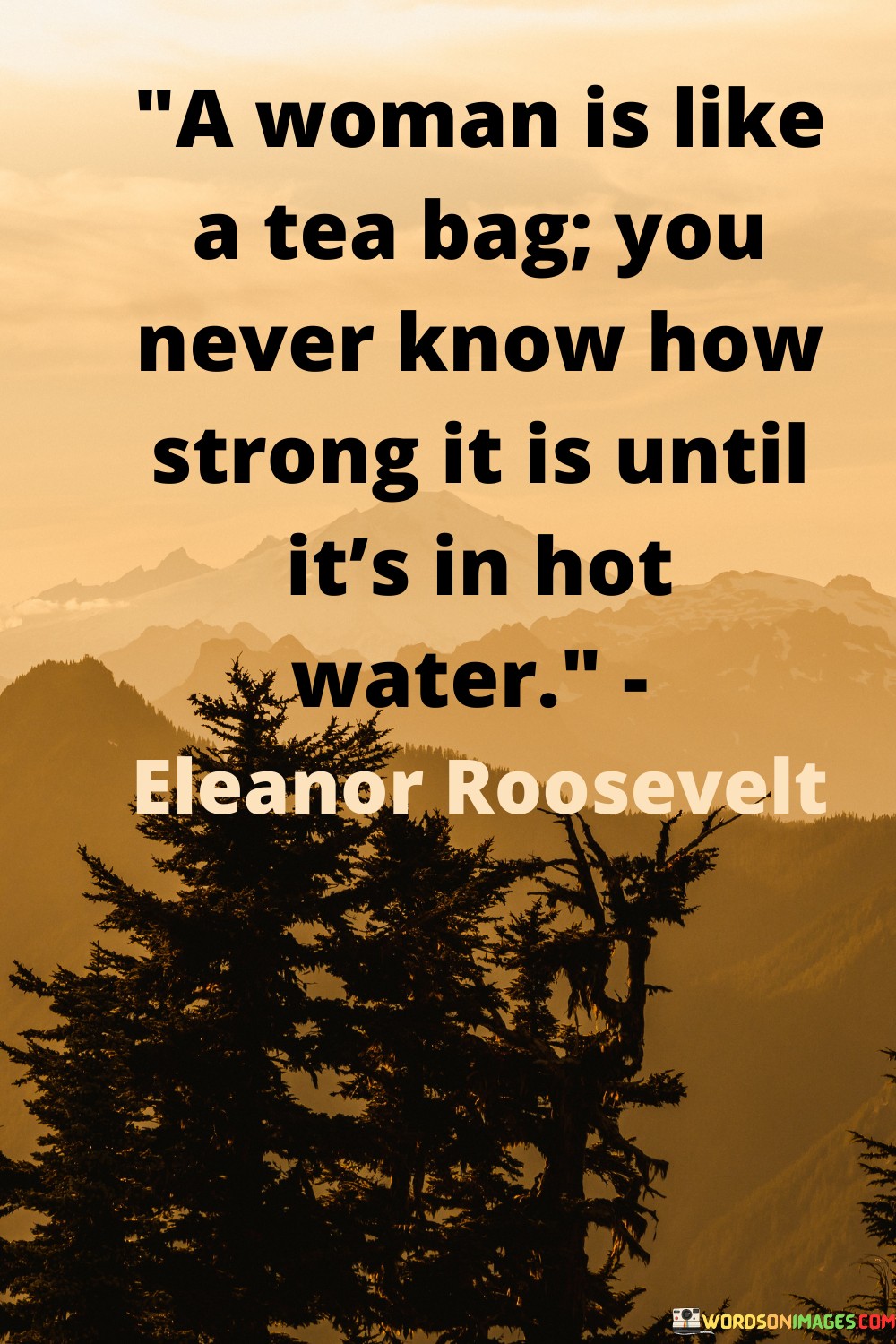 This quote beautifully illustrates the hidden strength and resilience that lies within a woman, comparing her to a tea bag that only reveals its true potency when exposed to hot water. It signifies that a woman's true character and inner power often emerge during times of adversity and challenges. Like a tea bag infusing its flavor when steeped in hot water, a woman's strength becomes apparent when she faces difficult situations, obstacles, or hardships.This quote celebrates the inherent resilience and fortitude that women possess. Just as the heat of boiling water brings out the full richness of tea, life's trials and tribulations can bring out the best in a woman, unveiling her determination, courage, and ability to overcome adversity. It emphasizes the transformative power of difficult experiences, where a woman's true strength shines through, helping her to navigate through the tough times with grace and perseverance.Moreover, the quote challenges the notion of underestimating women based on appearances or first impressions. It serves as a reminder that one should not judge a woman solely by her outward demeanor or perceived fragility, as her true strength lies within, waiting to be revealed when tested by life's challenges.In summary, the quote praises the inner strength and resilience of women, using the metaphor of a tea bag in hot water to highlight the transformative power of adversity. It encourages recognizing and appreciating the hidden strength of women, acknowledging that their true character and courage become evident when faced with life's difficulties. This quote celebrates the indomitable spirit of women and reminds us of the incredible strength that lies within each of them, waiting to be unleashed when the circumstances demand it.