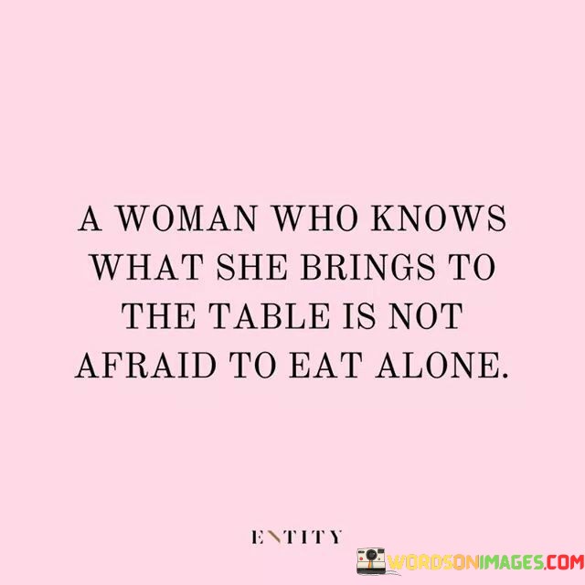 The metaphor of "eating alone" symbolizes the willingness to stand alone if necessary, rather than settling for less or compromising her worth. It portrays her resilience and ability to thrive even in the absence of external validation or support. This quote promotes the idea that it's better to be alone and true to oneself than to be in the company of those who do not appreciate or recognize her worth.
