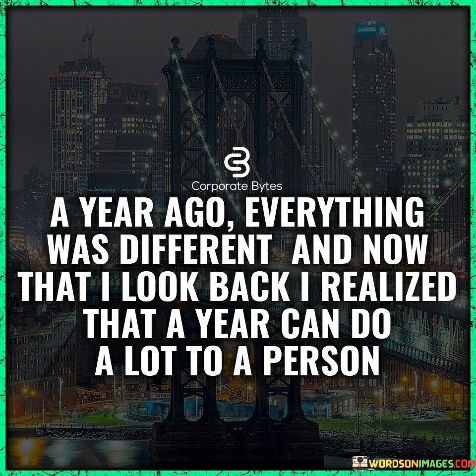 This quote reflects on the transformative power of time and personal growth over the span of a year. It suggests that looking back on the past can reveal how much change and development have occurred within that timeframe. The passage of a year can bring about profound shifts in perspective, circumstances, and personal evolution.