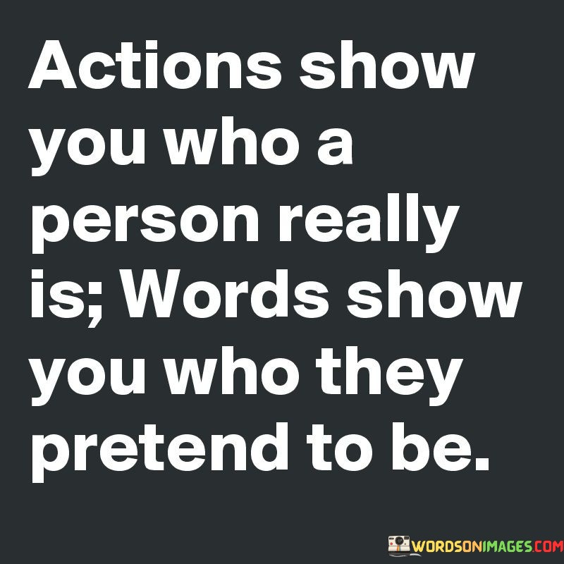 The quote suggests that an individual's true character is revealed through their actions. It implies that behavior reflects authenticity, while words can be deceptive. This perspective underscores the importance of observing consistent actions to assess someone's genuine nature.