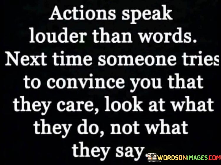 This quote emphasizes the significance of actions in understanding true intentions. In the first part, "actions speak louder than words," it underscores the power of deeds over verbal promises. The second part, "next time someone tries to convince you that they care," directs attention to people's attempts to convey care.