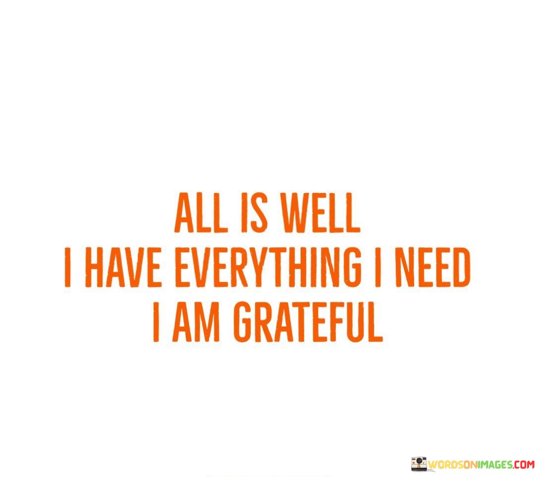 "All Is Well, I Have Everything I Need, I Am Grateful" reflects contentment and gratitude. In the first paragraph, the quote reassures that everything is in order, highlighting a sense of peace and acceptance. It acknowledges the sufficiency of one's circumstances.