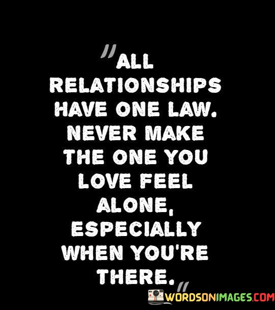 This statement encapsulates an important principle for maintaining healthy and loving relationships. It emphasizes that in any relationship, a fundamental rule is to never let the person you love feel alone, especially when you are physically present with them.