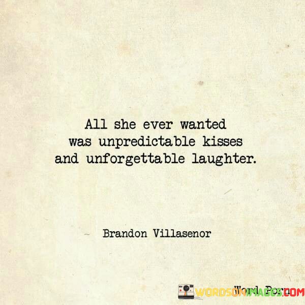 The statement beautifully captures the simple yet profound desires of the person described. "All she ever wanted was unpredictable kisses and unforgettable laughter" suggests that her heart's desires revolve around experiencing love and joy in their purest forms. She craves spontaneous and unexpected displays of affection in the form of unpredictable kisses, highlighting her yearning for genuine, affectionate connections.