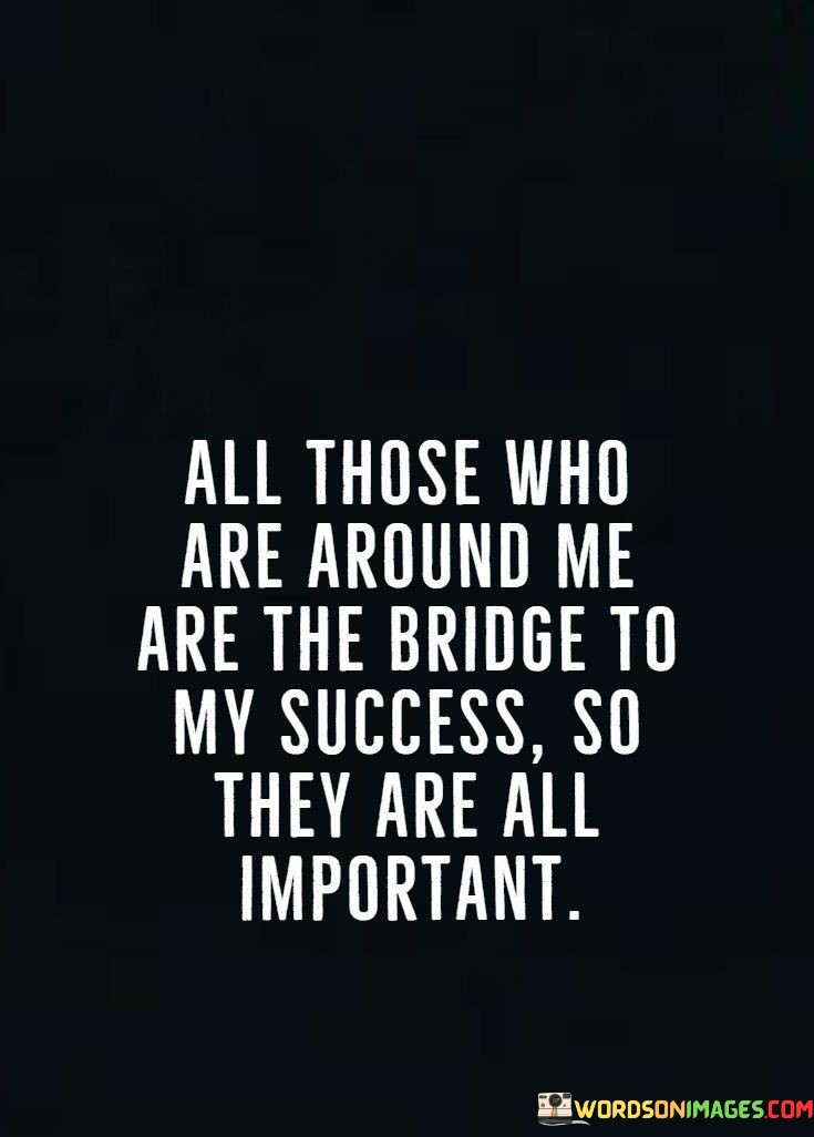 The phrase "All those who are around me are the bridge to my success, so they are all important" succinctly conveys the idea that the people in one's life play a significant role in supporting and contributing to their success.