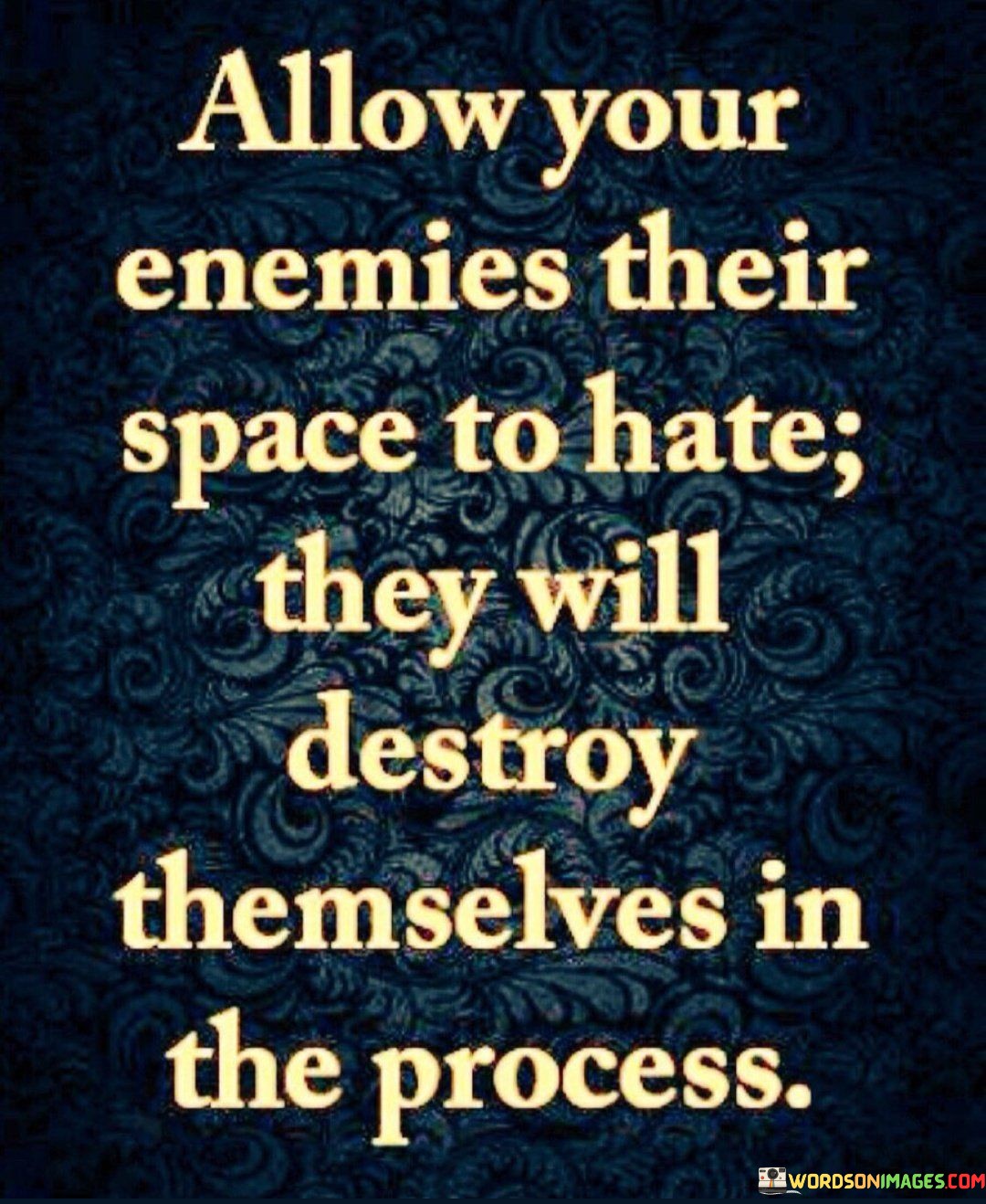 The quote "allow your enemies their space to hate; they will destroy themselves in the process" advises against engaging with negativity. It suggests that allowing adversaries to harbor hatred leads to their own undoing.