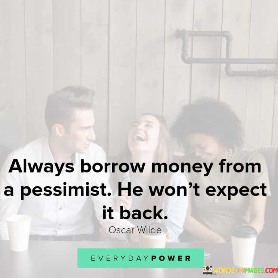 The humorous quote, "Always borrow money from a pessimist; he won't expect it back," playfully reflects the tendency of pessimistic individuals to have a negative outlook on life, including their expectations of the future. The quote suggests that borrowing money from someone who sees the world in a negative light might work to the borrower's advantage, as the pessimist may not anticipate the loan being repaid. The quote cleverly highlights the stereotype of pessimists being more cautious and doubtful about the positive outcomes of various situations. In this context, it humorously implies that the pessimist might not have high hopes for the money they lend and may not think they will receive it back. While it's meant in a light-hearted manner, it also pokes fun at the idea that pessimists tend to be more focused on potential negative outcomes rather than potential benefits. It is essential to remember that this quote is not meant to encourage or endorse taking advantage of others or failing to repay borrowed money. Responsible borrowing and financial integrity are crucial aspects of maintaining trust and healthy relationships with others. In a broader sense, the quote might also serve as a reminder to have a balanced outlook on life. While it's okay to be cautious and realistic about potential risks, it's equally important to have hope and optimism. Striking a balance between being aware of potential challenges and having a positive attitude towards opportunities can lead to a more fulfilling and well-rounded approach to life. Overall, the quote humorously portrays the contrast between pessimism and optimism and encourages us to find a healthy balance between the two. It reminds us that humor and light-heartedness can be valuable tools to navigate through life's challenges and differences in perspective. However, it's crucial to remember the importance of financial responsibility and treating others with respect and honesty when it comes to borrowing or lending money.