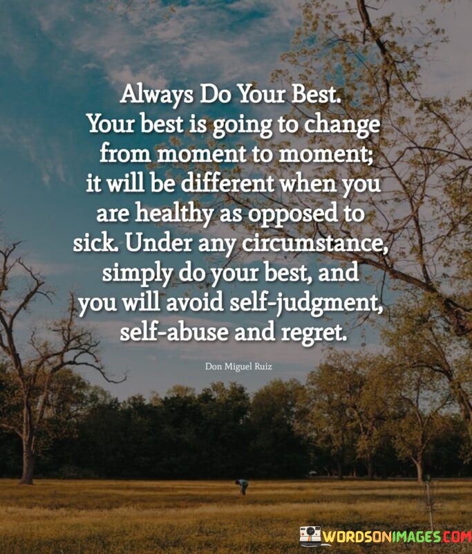 This quote advocates for a consistent effort while recognizing the variability of one's best. It suggests that one's optimal performance can change based on circumstances, health, and other factors. This perspective encourages individuals to focus on doing their best in any given situation to prevent negative self-criticism, harm, and remorse.