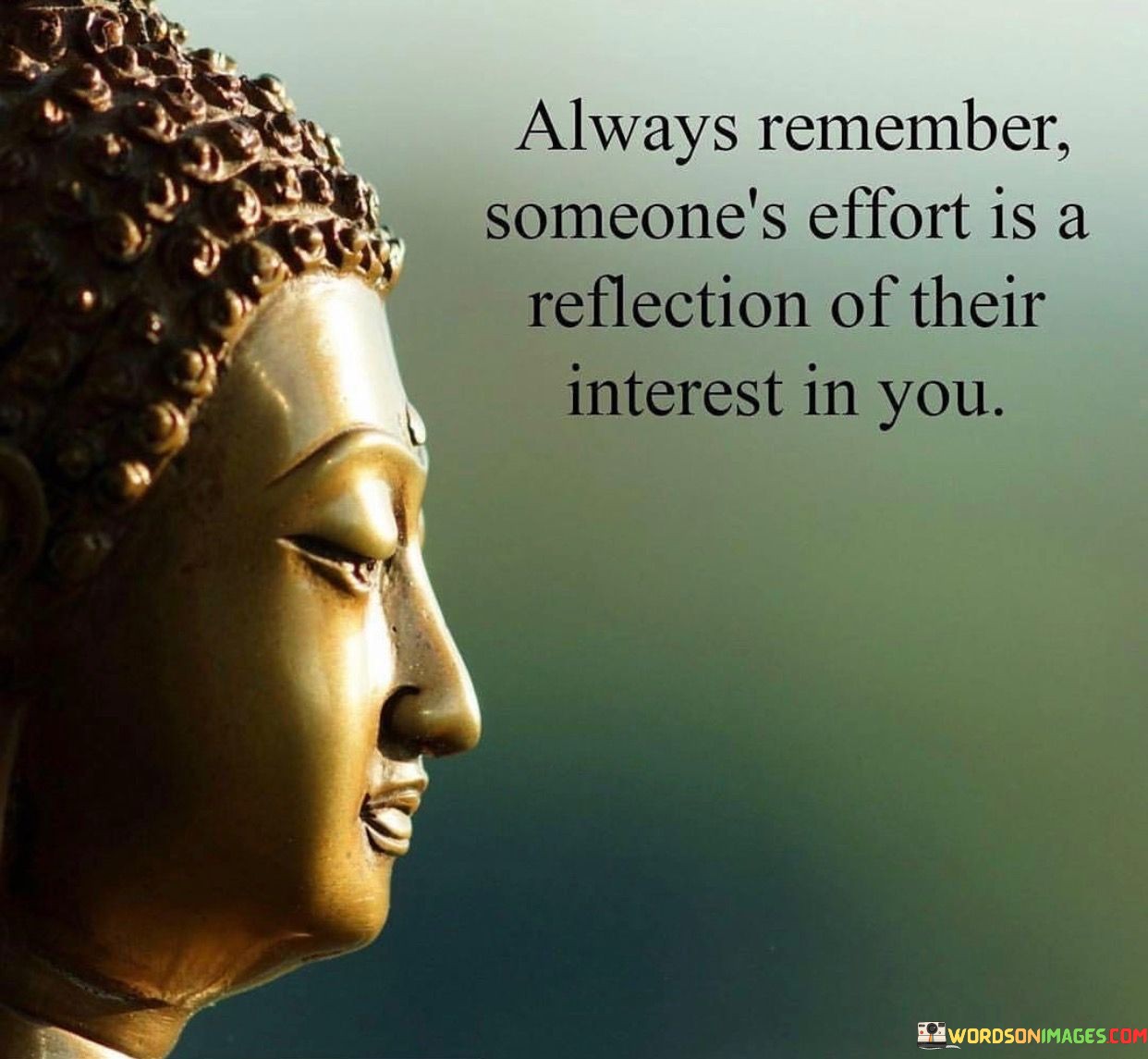 This quote means that when someone puts in effort to engage with you or do something for you, it shows that they care about you. The amount of effort they make reflects how interested they are in you. If someone goes out of their way to help or spend time with you, it's a sign of their genuine interest in building a connection.