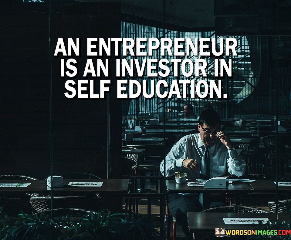The quote "An entrepreneur is an investor in self-education" encapsulates the essence of the entrepreneurial spirit and the crucial role that continuous learning plays in the success of an entrepreneur. It highlights the idea that the most valuable investment an entrepreneur can make is in their own personal and professional development through self-education. Entrepreneurship is a journey filled with challenges, uncertainties, and opportunities. As an entrepreneur embarks on their business venture, they face a myriad of decisions, obstacles, and changes. In this ever-evolving landscape, traditional knowledge and skills alone may not be sufficient to navigate the complexities of the market. Investing in self-education enables entrepreneurs to stay at the cutting edge of their industry and to continuously adapt to changing trends and demands. By seeking knowledge, insights, and expertise, entrepreneurs gain a deeper understanding of their field, potential customers, and competitors. This knowledge equips them to make informed decisions, identify opportunities, and mitigate risks, ultimately enhancing their chances of success. Furthermore, self-education empowers entrepreneurs to foster innovation and creativity. By exploring different subjects, learning from diverse perspectives, and exposing themselves to new ideas, entrepreneurs can think outside the box and develop novel solutions to problems. Entrepreneurship thrives on innovation, and self-education provides the fertile ground for groundbreaking ideas and unique approaches. Moreover, investing in self-education also reflects a growth mindset, a willingness to embrace challenges, and a commitment to continuous improvement. Successful entrepreneurs understand that learning is a lifelong journey, and they embrace every opportunity to expand their knowledge and skills.