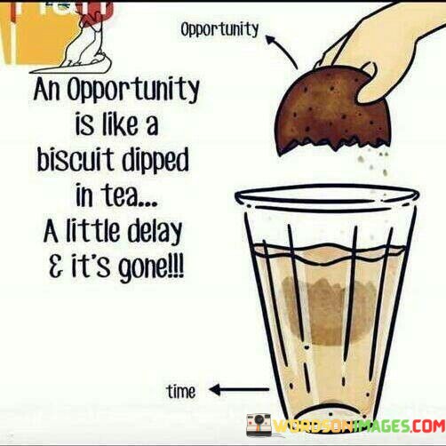 The quote highlights the essence of timeliness. Like a biscuit's limited immersion in tea, opportunities have a finite window for action. Delay can cause the chance to diminish or vanish, urging individuals to recognize the urgency of making decisions and taking steps to capitalize on favorable circumstances.