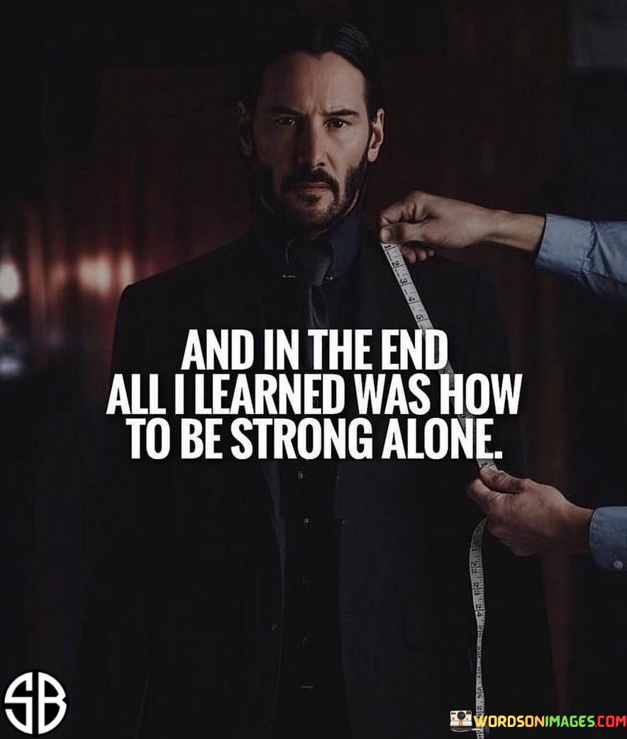 The quote "And in the End, All I Learned Was How to Be Strong Alone" conveys the experience of personal growth and self-reliance that can come from facing challenges and adversity on one's own.