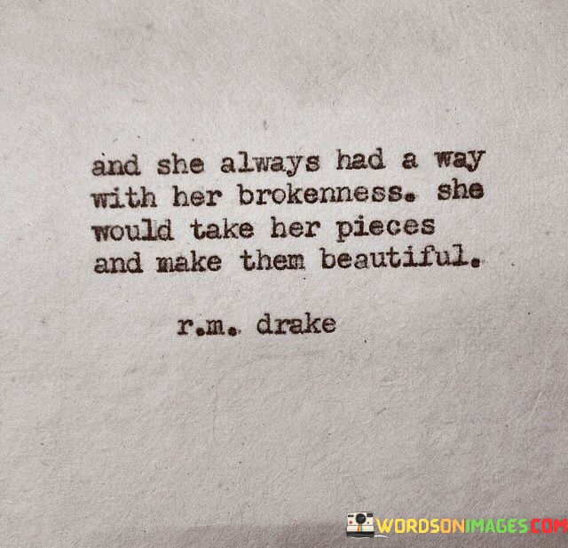 "And she always had a way with her brokenness; she would quote" suggests that despite experiencing challenges and brokenness in life, this woman possesses a remarkable ability to navigate through her struggles with poise and strength.