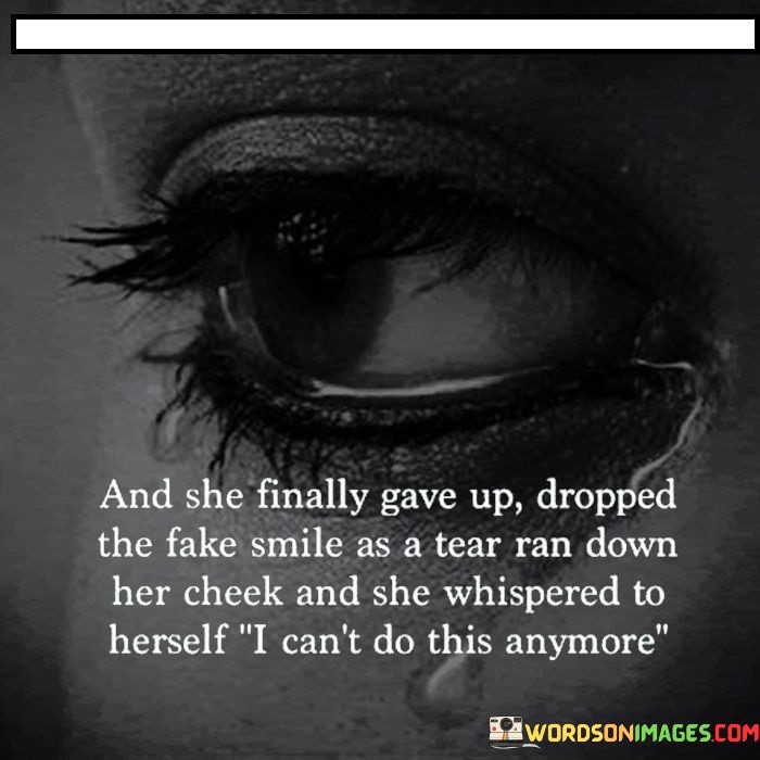 The quote portrays a poignant moment of surrender. "Gave up, dropped the fake smile" reflects letting go of pretense. "Tear ran down her cheek" symbolizes vulnerability. The quote captures a breaking point where the facade crumbles.