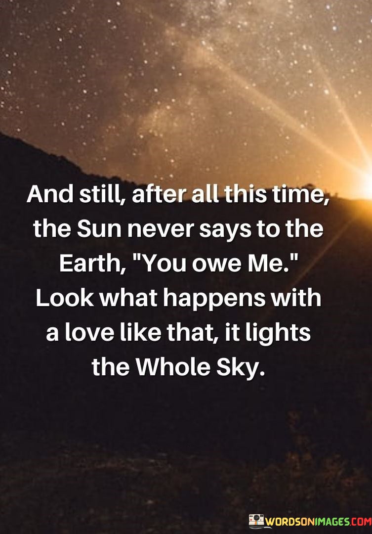 "And Still After All This Time The Sun Never Says To The Earth you owe me, look what happens with a love like that it lights the whole sky." This quote highlights the selfless and unconditional nature of love and giving. The sun's consistent illumination of the Earth without expecting anything in return signifies the purity of love. It metaphorically emphasizes that true love doesn't keep score or demand reciprocity. Instead, it radiates warmth and brightness, lighting up the entire sky as a testament to its boundless generosity.
