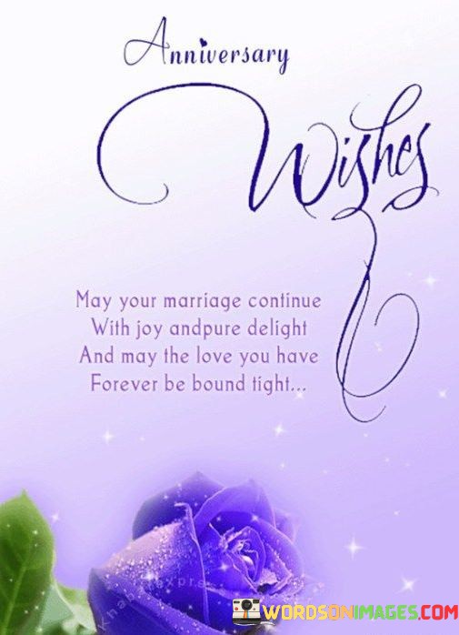 The quote, "May your marriage continue with joy and pure delight, and may the love you have forever be bound tight," is a heartfelt wish and blessing for a couple's enduring happiness and love in their marriage. It expresses the hope that their union will be filled with joy, happiness, and genuine delight. The words convey the desire for the couple's love to remain strong and unwavering, bound tightly together throughout their journey of life together. This wish encapsulates the well-wishes of family and friends who want nothing but the best for the couple, hoping that their love will grow stronger with each passing day, and that their marriage will be filled with love, laughter, and cherished moments. At its core, the quote celebrates the joy and happiness that a loving marriage can bring. It conveys the hope that the couple's journey together will be marked by moments of delight and contentment, where they find joy in each other's company and in the shared experiences they encounter. Moreover, the quote speaks to the importance of love as the foundation of a lasting and fulfilling marriage. Love is the cornerstone of any successful relationship, and the wish for the couple's love to be bound tightly emphasizes the desire for their bond to remain unbreakable and steadfast, even during times of challenge or difficulty. Furthermore, the quote highlights the significance of well-wishes and blessings from loved ones. In sharing this wish, family and friends express their support and encouragement for the couple's journey together. Their love and support play an integral role in the couple's happiness and provide a sense of community and connection. In conclusion, the quote "May your marriage continue with joy and pure delight, and may the love you have forever be bound tight" is a heartfelt wish and blessing for a couple's enduring happiness and love in their marriage. It encapsulates the desire for their union to be filled with joy, happiness, and genuine delight, and for their love to remain strong and unwavering as they embark on their journey of life together. The quote represents the well-wishes and support of family and friends who want nothing but the best for the couple, hoping that their love will grow deeper and that their marriage will be filled with love, laughter, and cherished moments. It celebrates the transformative power of love and the importance of sharing blessings and good wishes with those we care about. Ultimately, the quote symbolizes the beauty and joy that love and marriage can bring into people's lives.