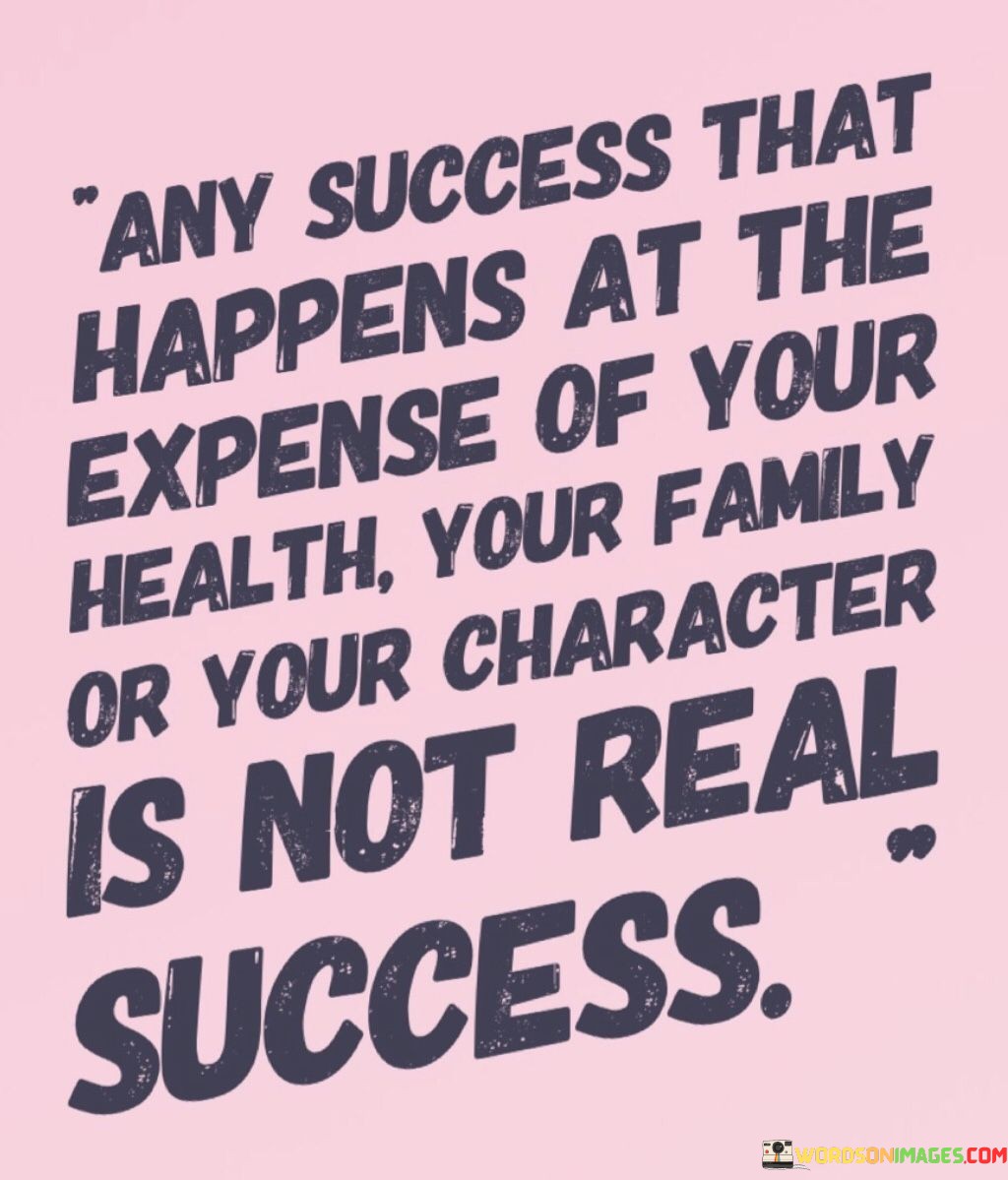 The statement underscores the concept of values. It implies that success achieved through sacrifices that undermine health, family, or character lacks authenticity. This sentiment encourages individuals to prioritize their overall quality of life.