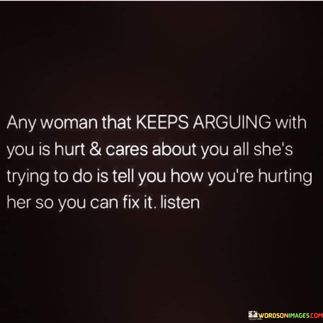 This quote sheds light on the dynamics of communication between individuals, particularly in relationships, and emphasizes the importance of empathy and understanding. The phrase "any woman that keeps arguing with you is hurt and cares about you" suggests that when a woman engages in repeated arguments with someone, it indicates that she is emotionally affected by the situation and has genuine feelings invested in the relationship. Rather than viewing her arguments as mere conflicts, the quote urges us to recognize that her emotions stem from a place of hurt and concern. It underscores the significance of active listening and comprehension when confronted with such situations. The quote explains that her intention is not to create strife but to convey her pain and illustrate how the actions of the other person are causing her distress. By understanding her perspective and acknowledging her emotions, one can take steps to rectify the situation and address the underlying issues, fostering healthier communication and a stronger bond.