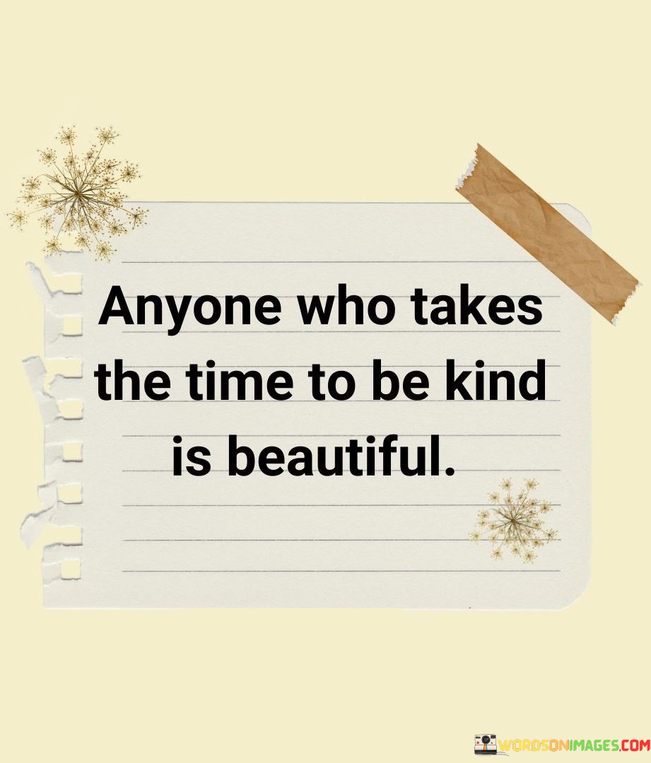 In essence, the statement captures the essence of the beauty of compassion. "Anyone Who Takes The Time To Be Kind Is Beautiful" encourages valuing and appreciating individuals who spread kindness, emphasizing the lasting and profound impact of their actions on the world around them.