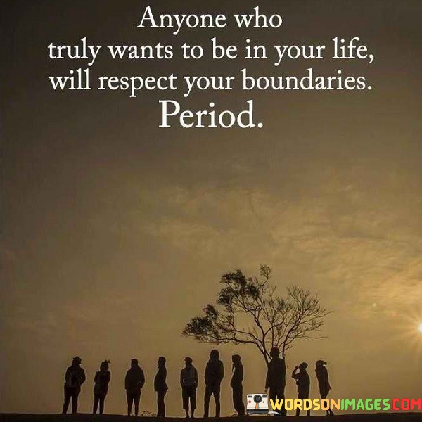"Anyone who truly wants to be in your life will respect your boundaries, period" underscores the significance of setting and maintaining healthy boundaries in relationships. It emphasizes that genuine connections are built on mutual understanding, respect, and consideration for each other's limits.
