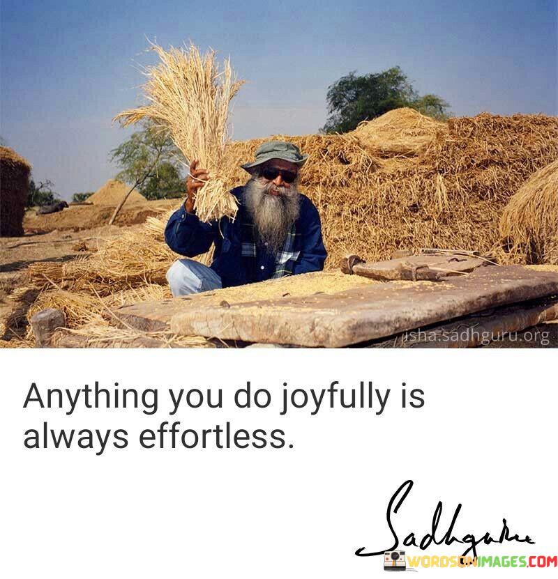 Ultimately, the quote advocates for finding joy in tasks. It prompts us to prioritize activities that bring happiness. By associating joyful engagement with seamless effort, the quote empowers us to infuse our actions with positivity, making them not only more enjoyable but also more effective.