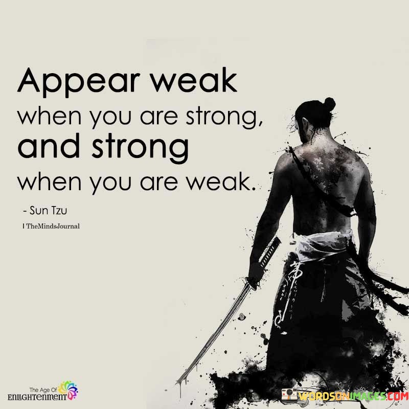 This quote advises strategic behavior based on perception. In the first part, "appear weak when you are strong," it suggests downplaying strength. The second part, "strong when you are weak," recommends projecting strength even in vulnerable moments.