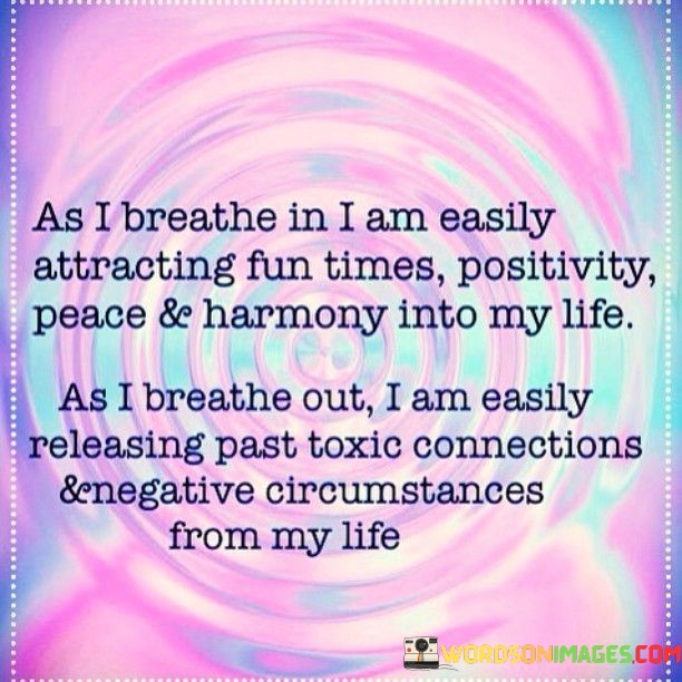 Absolutely! This statement is about the power of breath and intention to attract positive experiences while letting go of negativity. In the first paragraph, it means that as the speaker inhales, they are welcoming enjoyable moments, positivity, peace, and harmony into their life.