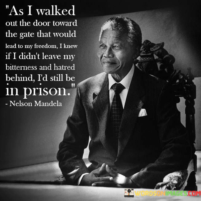 In essence, the quote suggests that the key to achieving genuine freedom lies in leaving behind bitterness and hatred. The speaker acknowledges that holding on to these negative feelings can act as emotional shackles, imprisoning them even after physical constraints have been removed.
