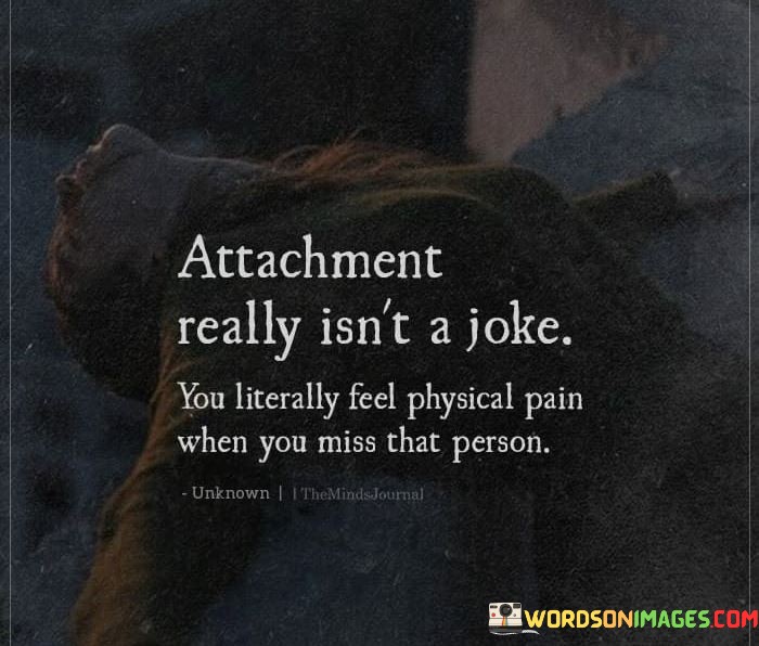 The quote, "Attachment Really Isn't A Joke, You Literally Feel Physical Pain When You Miss That Person," emphasizes the seriousness of emotional connections and the way they can manifest in our bodies. It points to the depth of feelings involved in attachment.