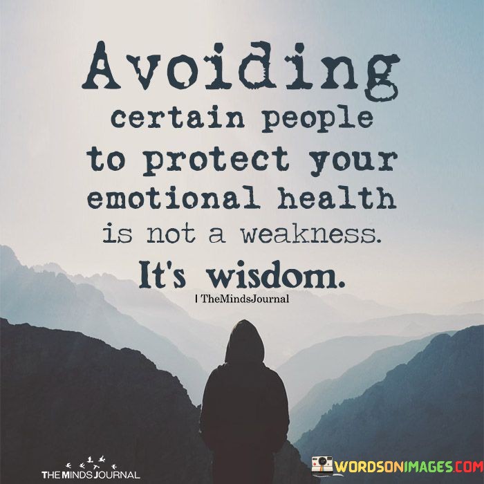 This thought-provoking quote sheds light on the importance of setting boundaries and prioritizing one's emotional well-being. The phrase "avoiding certain people to protect your emotional health is not a weakness, it's wisdom" challenges the common misconception that avoiding toxic or harmful individuals signifies weakness. On the contrary, the quote asserts that choosing to distance oneself from people who negatively impact one's emotional health is an act of strength and self-preservation. It highlights the importance of recognizing when a relationship or interaction is detrimental and having the courage to step away from it for the sake of mental and emotional well-being. Setting healthy boundaries and prioritizing self-care is a sign of wisdom and self-awareness, as it demonstrates the ability to protect one's emotional state and maintain a sense of inner peace. This quote advocates for the empowerment of individuals to prioritize their emotional health and make decisions that promote their overall well-being, even if it means disengaging from certain people or situations. By doing so, individuals demonstrate their strength in acknowledging their own needs and protecting themselves from harm, thus fostering personal growth and resilience. Ultimately, this quote serves as a reminder that taking care of one's emotional health is a courageous act, highlighting the importance of self-compassion and empowerment in navigating relationships and life's challenges.